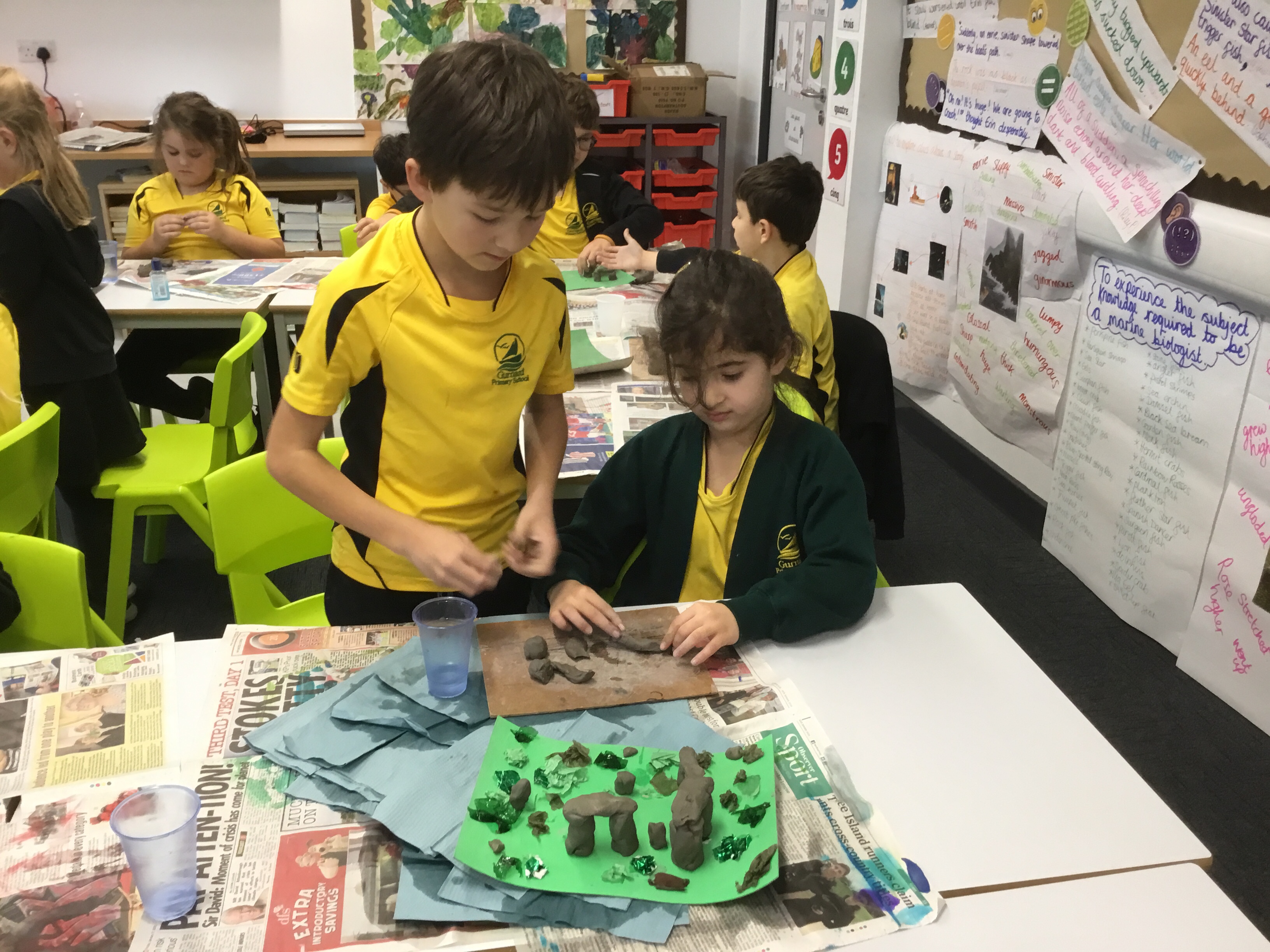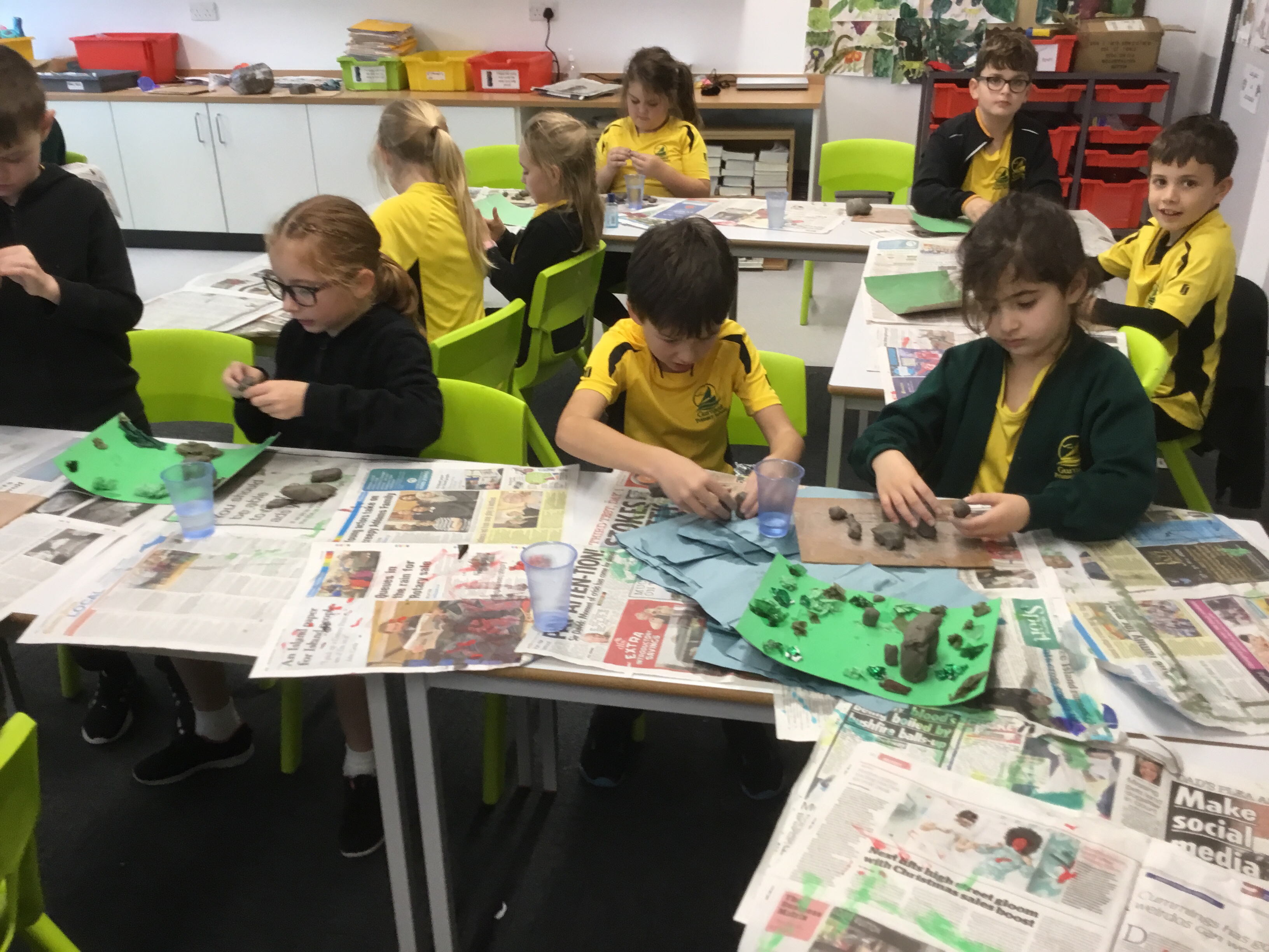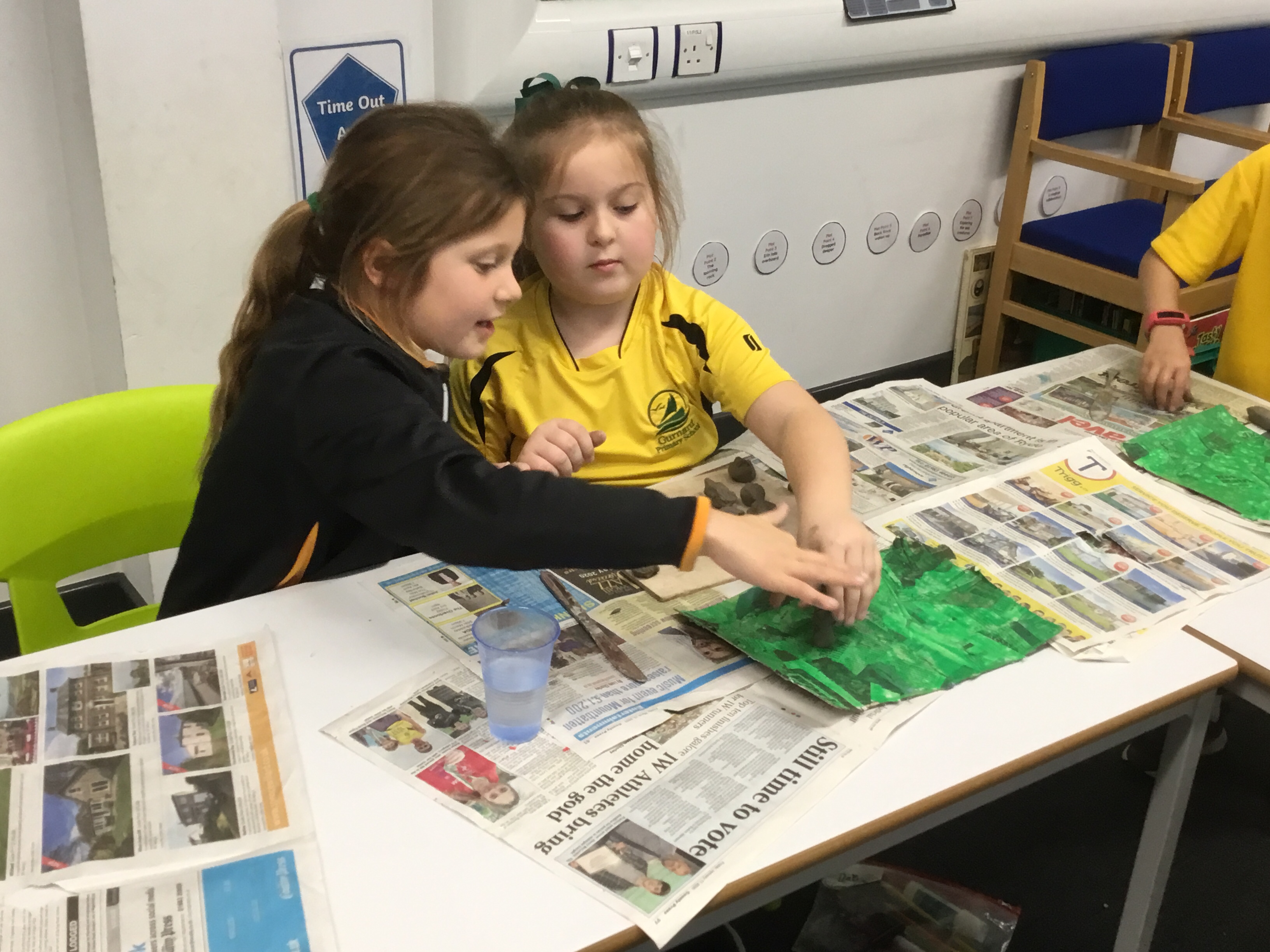 Year 3 worked with their partners to prepare their bases for their clay models of Stonehenge. They were given the choice of using paper mache with glue and green paint, painting , using felt and tissue paper and covering their board with paper, cellophane and tissue paper.